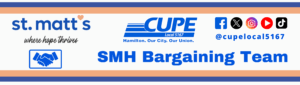 SMH BARGAINING INFORMATION SESSIONS Cathedral Café Drop In ONLINE (link will be posted to CUPE Local 5167 website 15mins prior) DATE: Monday, March 23rd, 2026 TIME: 4:30pm St. Matt’s Day Care Centre ONLINE (link will be posted to CUPE Local 5167 website 15mins prior) DATE: Thursday, March 26th, 2026 TIME: 6:30pm AGENDA: Bargaining Survey Presentation