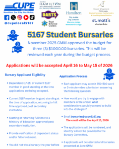Applications will be accepted April 16 to May 15 of 2026 Bursary Applicant Eligibility Dependent (17-25) of current 5167 member in good standing at the time applications are being excepted. Current 5167 member in good standing at the time of application, returning to full time approved post secondary institution. Starting or returning full
